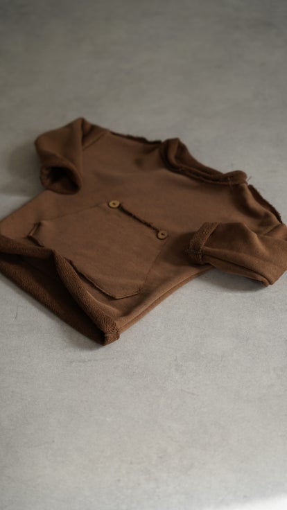Chiller Sweater in der Farbe Schokobrau, mit ausgefransten Nähten.